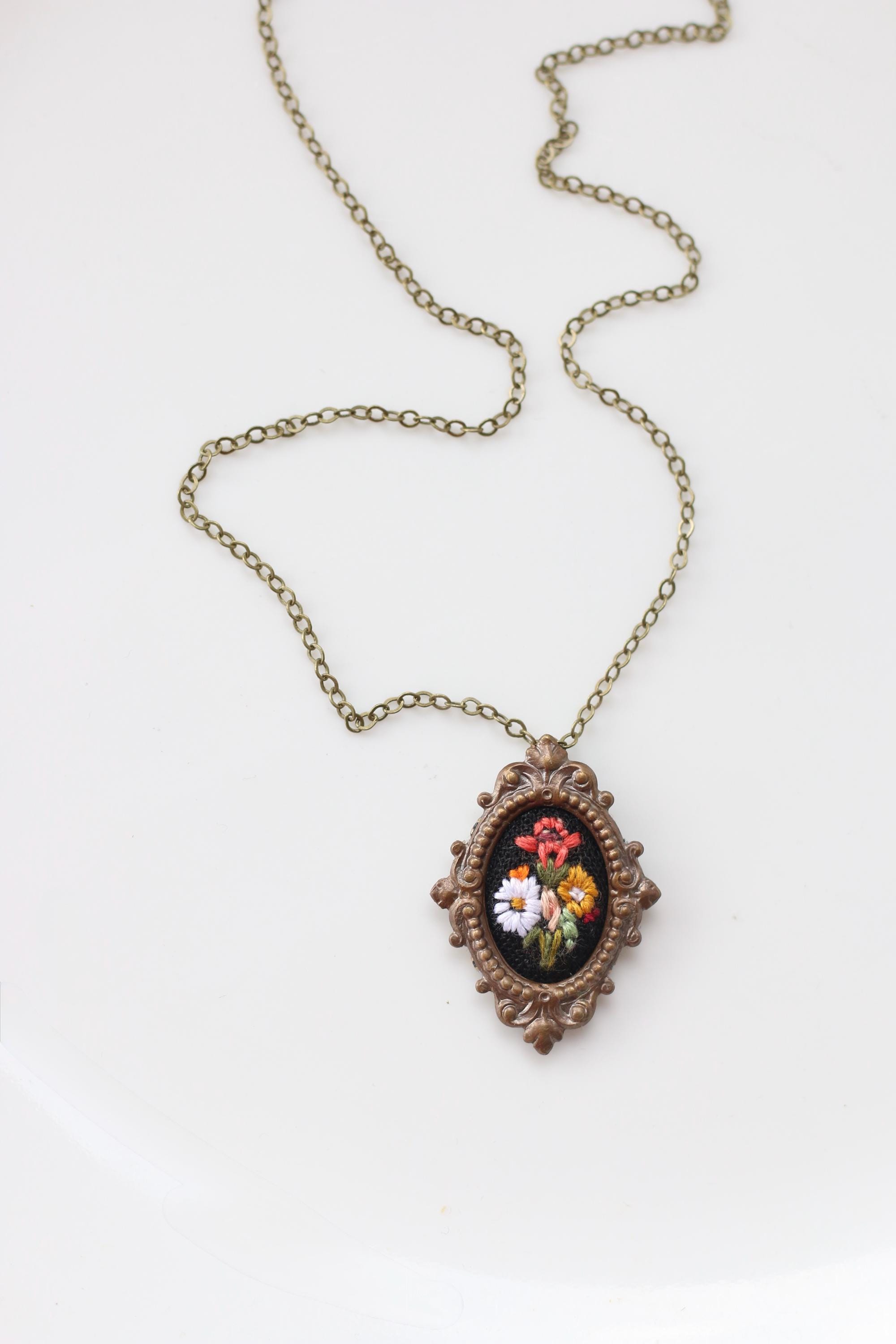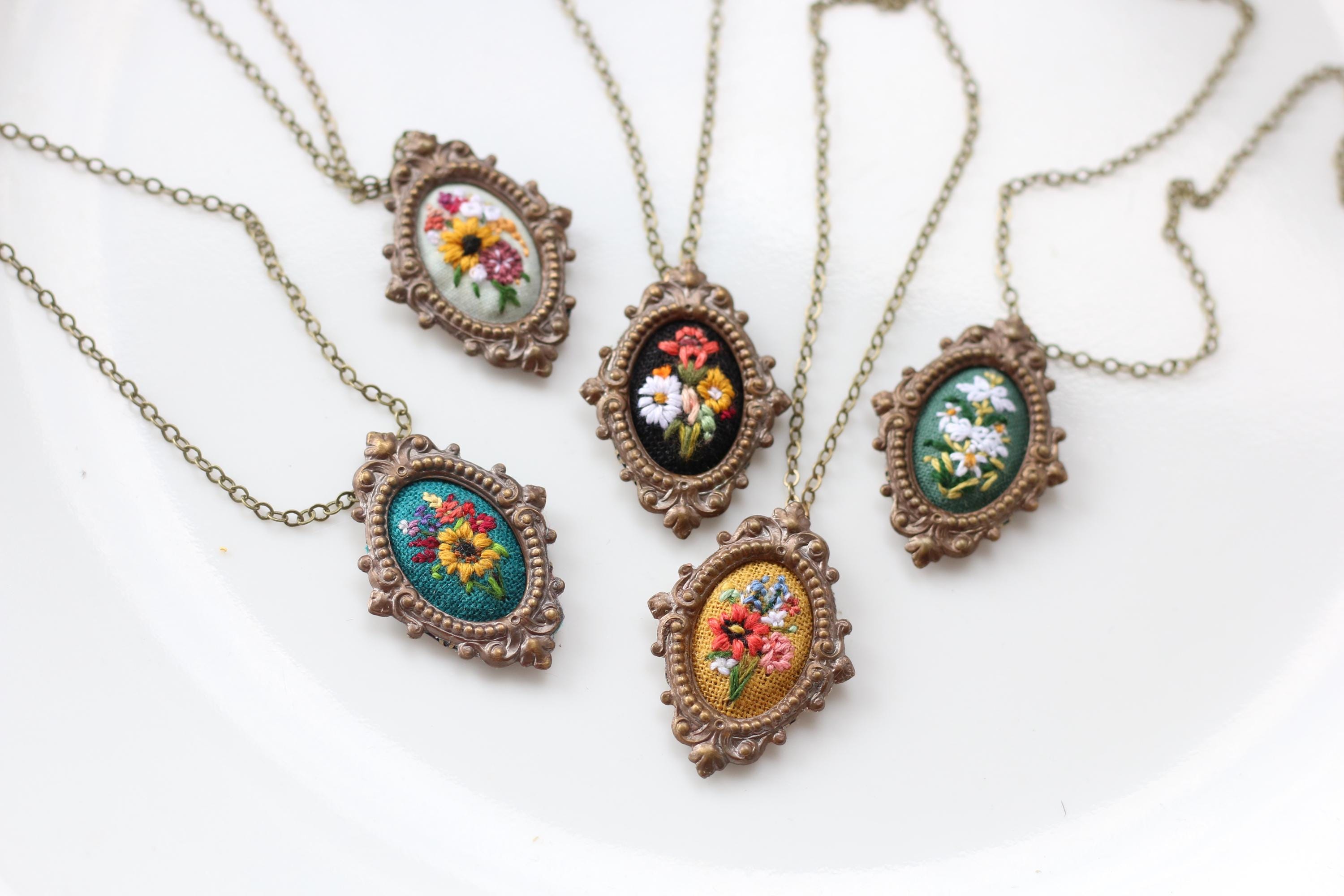 Since these necklaces are hand embroidered, each piece is one of a kind and might slightly differ from the photographed necklace.