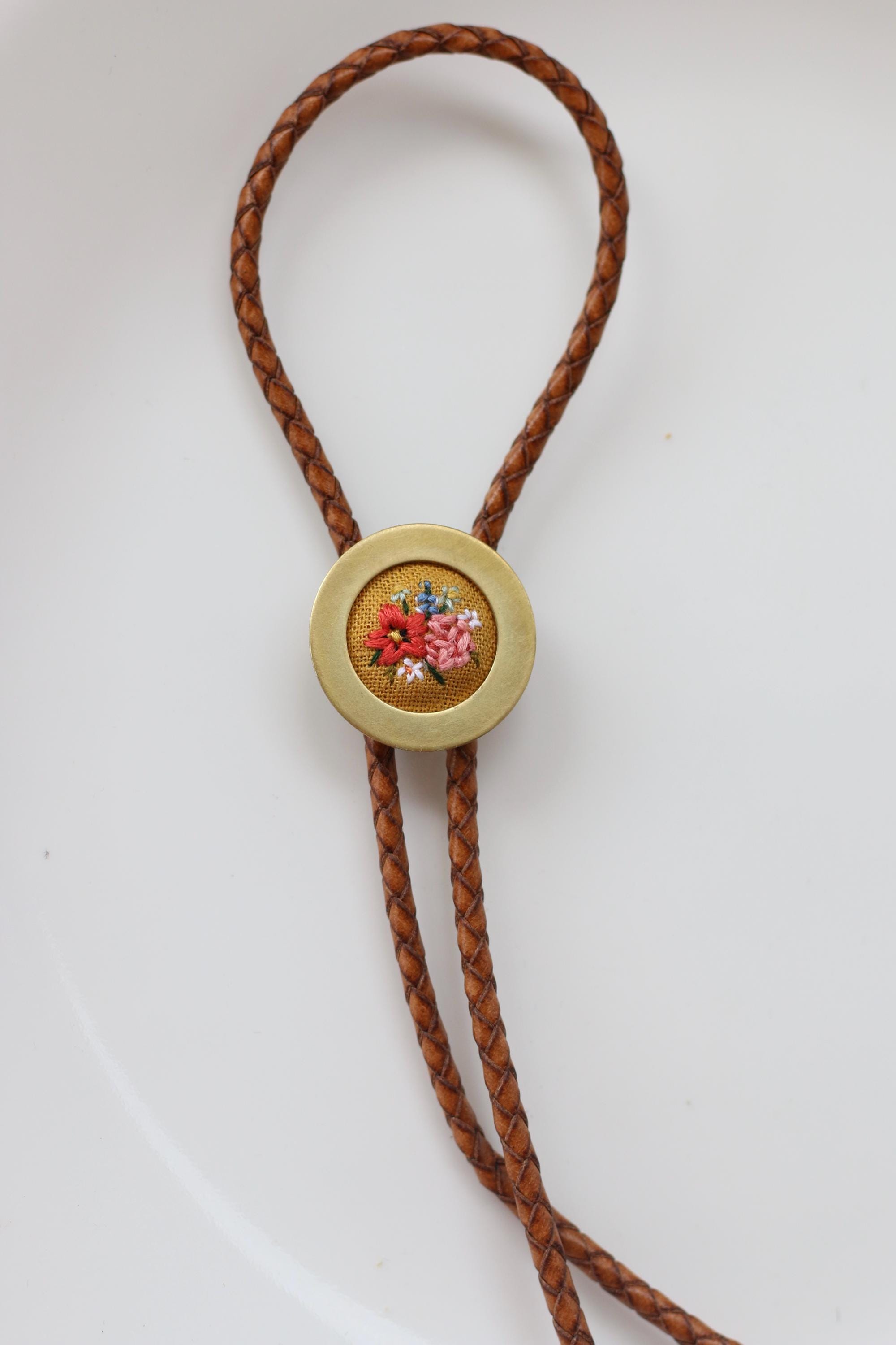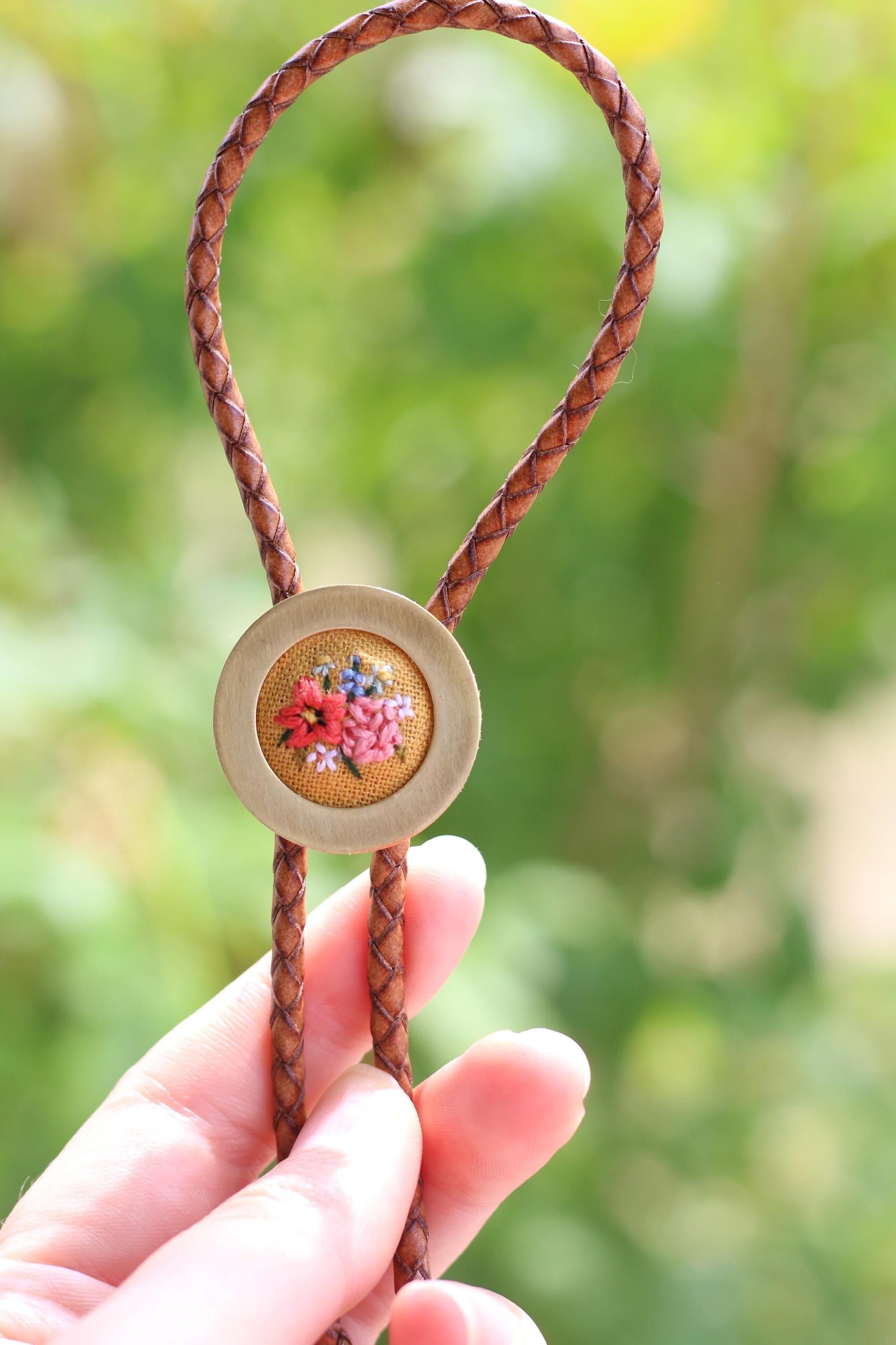 Since these bolo ties are hand embroidered, each piece is one of a kind and might slightly differ from the photographed bolo tie.